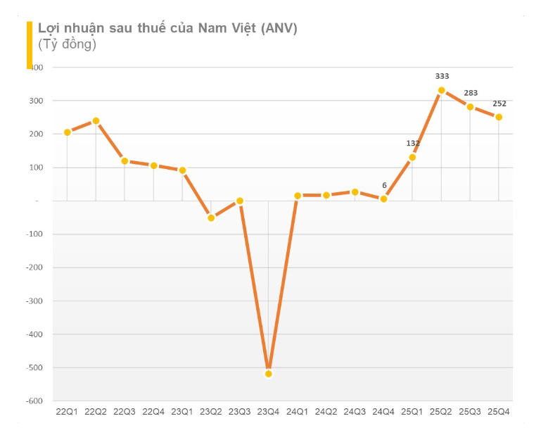 ANV lãi sau thuế trong quý 4 đạt gần 252 tỷ đồng, gấp 42,5 lần so với mức lãi chỉ gần 6 tỷ đồng của quý 4/2024.