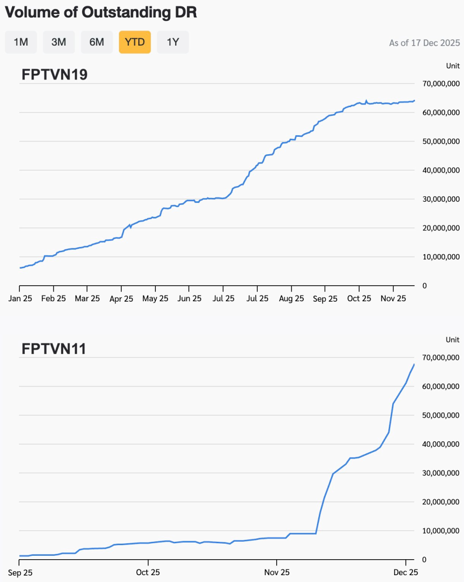 Theo Sở Giao dịch Chứng khoán Thái Lan (SET), tính đến ngày 17/12/2025, lượng chứng chỉ lưu ký DR FPT (mã FPTVN19) dựa trên cổ phiếu FPT do Chứng khoán Yuanta phát hành đã thiết lập mức kỷ lục mới, đạt gần 64,3 triệu đơn vị. So với đầu năm, quy mô DR này đã tăng thêm khoảng 58 triệu đơn vị. Với tỷ lệ chuyển đổi 10:1, nhà đầu tư Thái Lan hiện đang gián tiếp sở hữu hơn 6,4 triệu cổ phiếu FPT thông qua sản phẩm này.