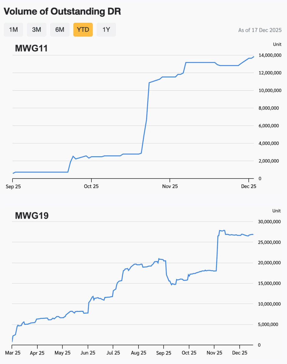 Tính đến ngày 17/12/2025, lượng DR MWG19 đã xấp xỉ 27 triệu đơn vị, tương ứng giá trị vốn hóa khoảng 268 triệu baht. Với tỷ lệ chuyển đổi 10:1, nhà đầu tư Thái Lan đang gián tiếp nắm giữ khoảng 2,7 triệu cổ phiếu MWG. Trong khi đó, DR MWG11 ghi nhận gần 14 triệu đơn vị đang lưu hành, với vốn hóa khoảng 55 triệu baht. Tỷ lệ chuyển đổi 25:1 cho thấy nhà đầu tư xứ Chùa Vàng đang gián tiếp sở hữu gần 0,55 triệu cổ phiếu MWG thông qua sản phẩm này.