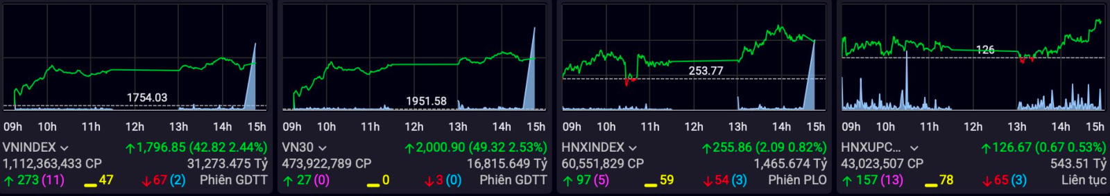 VN-Index đóng cửa phiên 11/2 tăng 42,82 điểm (+2,44%) lên mức 1796,85 điểm. Con số này đưa chứng khoán Việt Nam nằm trong top thị trường tăng mạnh nhất khu vực Châu Á trong phiên vừa qua. Thanh khoản thị trường được cải thiện so với phiên trước, giá trị giao dịch trên HoSE đạt hơn 31.000 tỷ đồng.