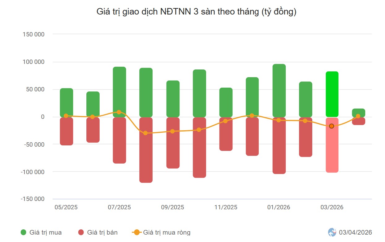 Một diễn biến đáng chú ý khác là câu chuyện của khối ngoại. Thống kê cho thấy nhà đầu tư ngoại vẫn đang đẩy mạnh bán ròng trên cả ba sàn, lên gần 17.500 tỉ đồng trong tháng 3, cao hơn gấp 2,2 lần lượng bán ròng trong tháng trước đó. Tuy nhiên, điểm tích cực là dòng tiền những phiên đầu tiên của tháng 4 lại ghi nhận mua ròng hơn 750 tỉ đồng.