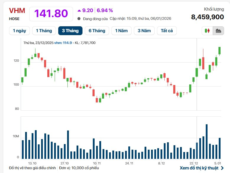 Tăng 6,94% lên 141.800 đồng, cổ phiếu VHM của Vinhomes dẫn đầu nhóm kéo chỉ số chính VN-Index “thăng hoa”. Đây cũng là phiên điểm thứ 3 liên tiếp (gồm 2 phiên tăng trần) của mã cổ phiếu địa ốc này, thị giá tăng gần 21%, tương ứng tăng 24.300 đồng/cổ phiếu.