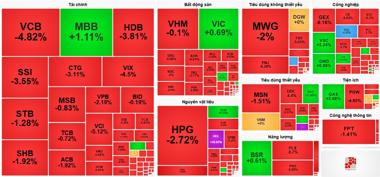 Ngoài ra, loạt cổ phiếu vốn hóa lớn tại các nhóm ngành khác cũng giảm sâu, gây áp lực mạnh lên chỉ số chính, như: HPG -2,72%, DGC -3,55%, GVR -2,5%, POW -4,93%, HAG -5,29%, VHC -5,51%, SAB -2,68%, PNJ -6,28%, MWG -2%, GEX -6,16%, …
