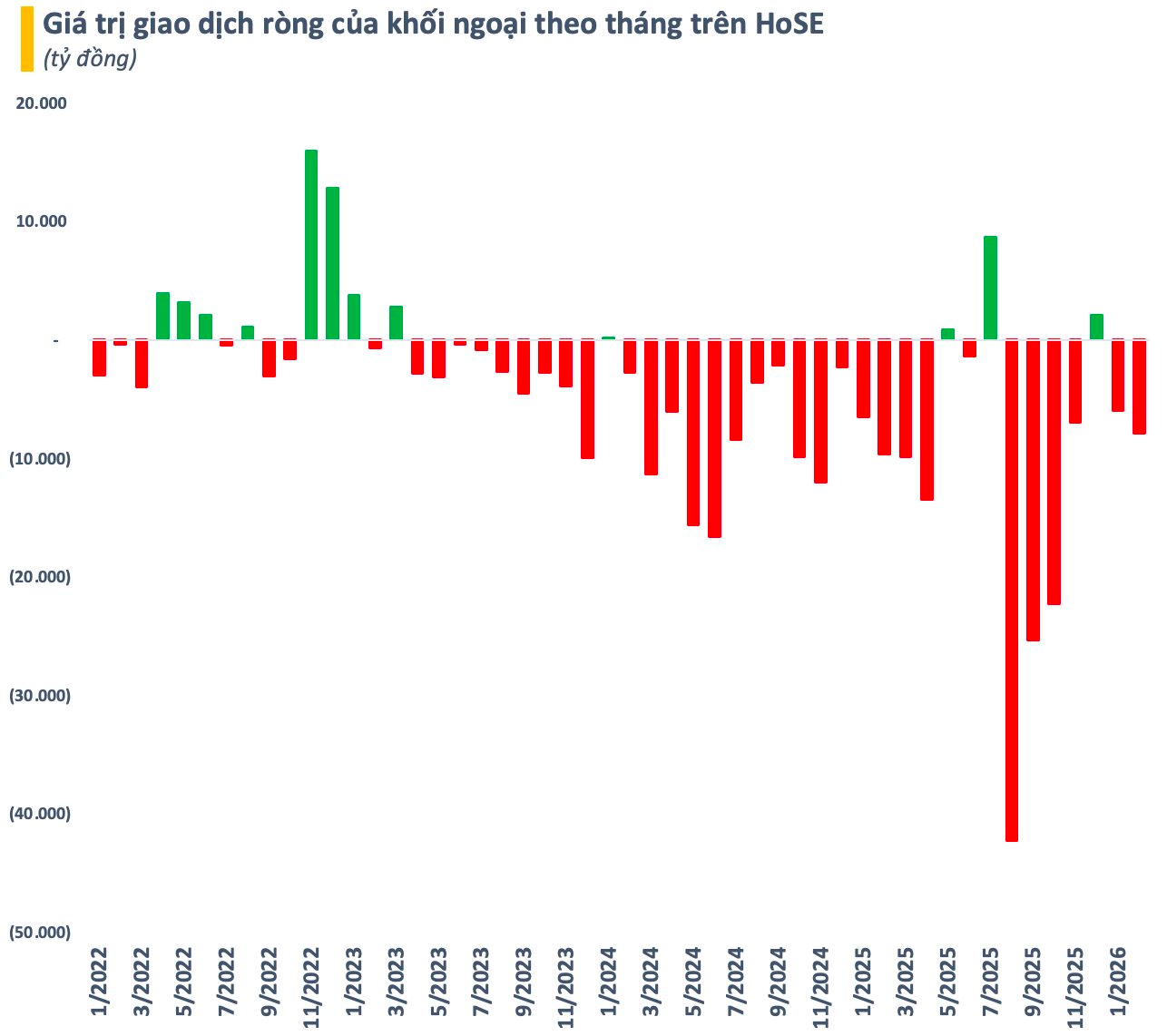 Mặc dù số lượng tài khoản liên tục tăng xét về mặt giao dịch khối ngoại vẫn rút ròng. Riêng trong tháng 3, khối ngoại đã bán ròng 17.600 tỷ trên HoSE qua đó năng giá trị luỹ kế từ đầu năm lên hơn 31.000 tỷ đồng. Xu hướng này đã kéo dài nhiều năm, riêng trong năm 2025 trước đó giá trị bán ròng còn lập kỷ lục 125.000 tỷ đồng.