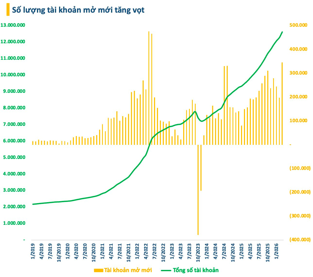 Theo số liệu từ Trung tâm lưu ký Chứng khoán Việt Nam (VSD), số lượng tài khoản của nhà đầu tư trong nước đã tăng thêm gần 346.000 tài khoản trong tháng 3/2026. Con số này cao hơn 150.000 tài khoản so với tháng liền trước. Đây là số lượng tài khoản tăng thêm nhiều nhất trong gần 4 năm kể từ giai đoạn tháng 5-6/2022.