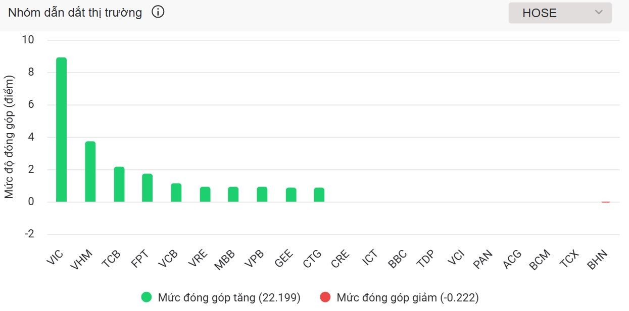Dẫn đầu là VIC của Vingroup tăng 5,1% lên 211.200 đồng/cp – đánh dấu phiên tăng thứ 6 trong 8 phiên gần nhất, đóng góp 8,93 điểm cho VN-Index. Theo sau VIC là VRE tăng 5,6%, VHM tăng 4,4%, FPT tăng 4,7%, MWG tăng 3,2%, HPG và VNM cùng tăng 1,5%.