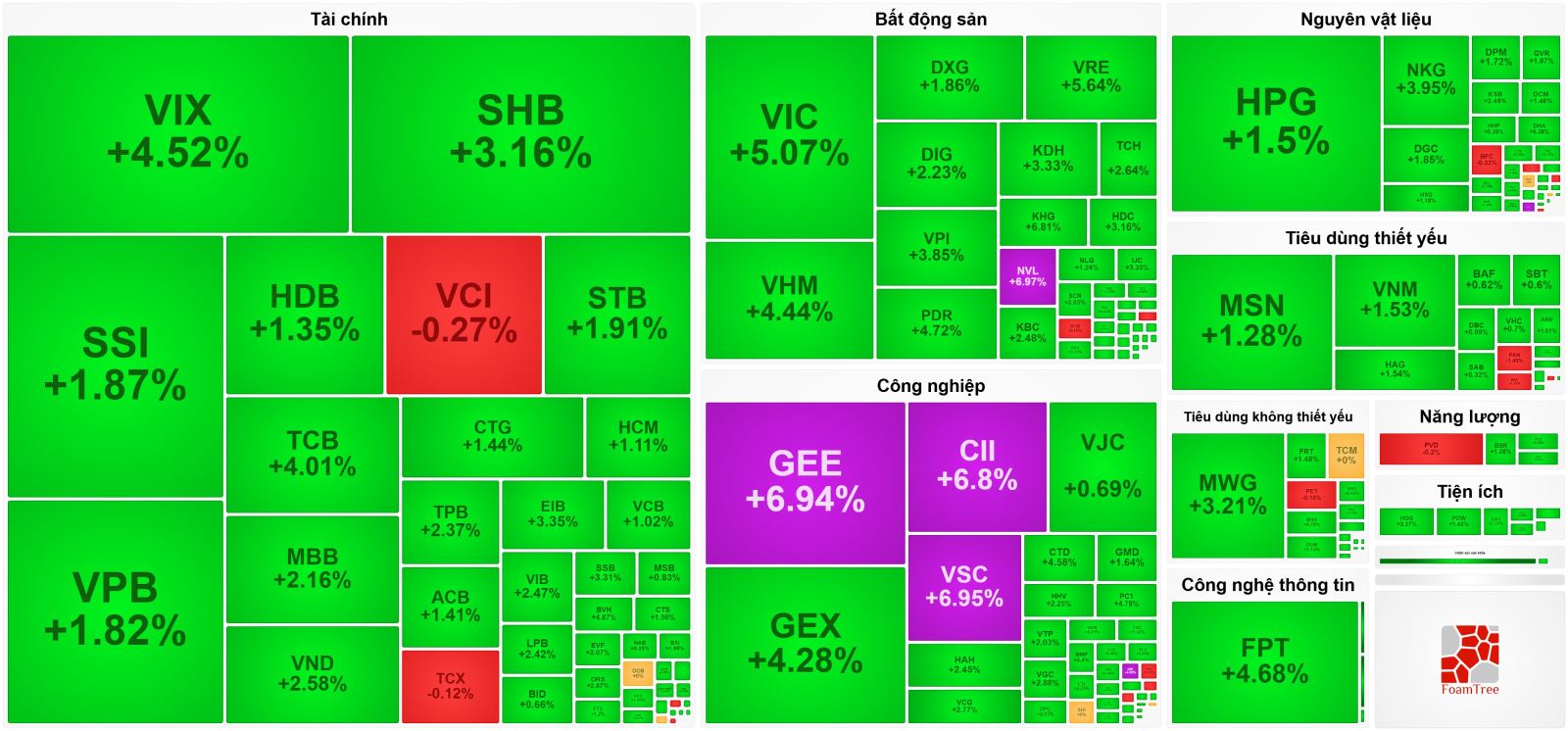 Cổ phiếu bất động sản đồng loạt hồi phục mạnh cùng nhóm VIC – VRE – VHM. Hai mã lớn NVL và CII cùng tăng trần, với thanh khoản lần lượt 6,25 triệu và 18 triệu đơn vị. Ngoài ra, hàng loạt mã tăng mạnh khác như KHG (+6,8%), CEO (+5,3%), NRC (+4,8%), PDR (+4,7%), TAL (+4,4%), VPI (+3,8%), DXS và KDH cùng tăng 3,3%.