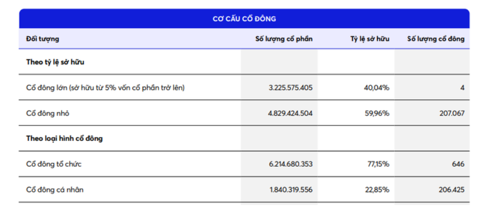 Tuy vậy cơ cấu sở hữu vẫn nghiêng về khối tổ chức, khi nhóm này nắm giữ hơn 77% vốn điều lệ, trong khi cổ đông cá nhân chiếm khoảng 22,85%.