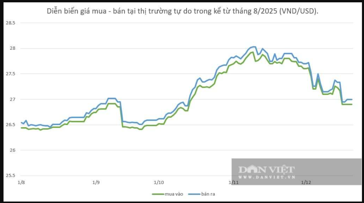 Sang tháng 11/2025, tỷ giá tại thị trường tự do tiếp tục tăng "nóng", có thời điểm giá bán ra vượt ngưỡng 28.000 đồng/USD khiến biên độ chênh lệch giữa thị trường tự do - chính thức ở mức 1.658 đồng/USD.