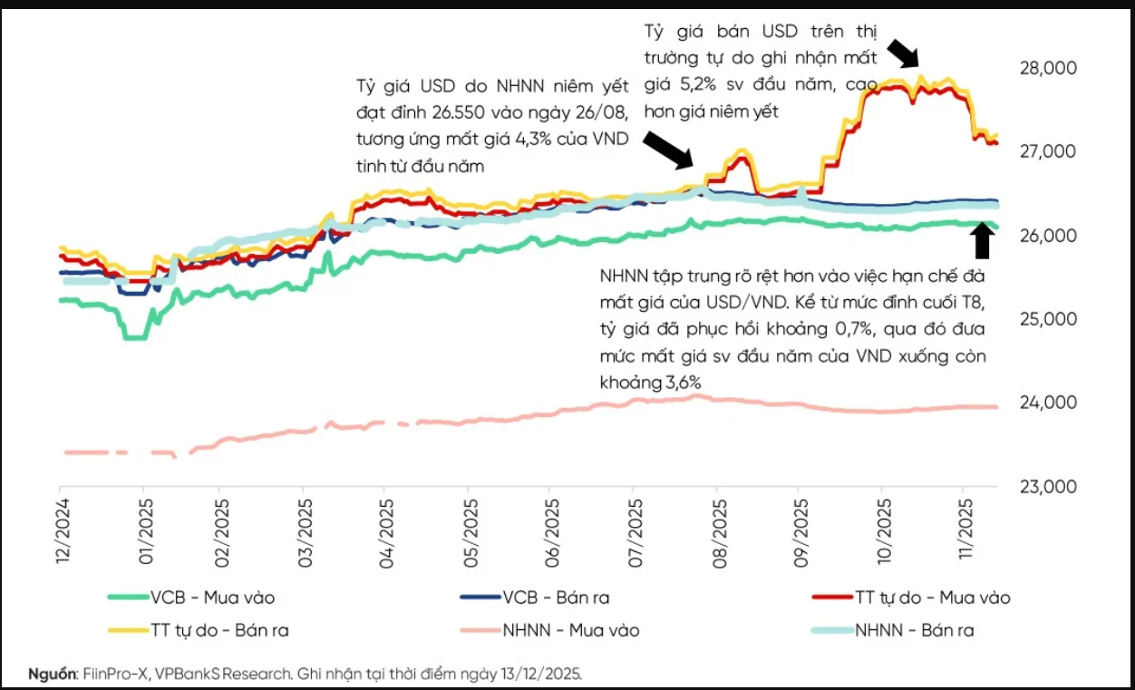 Trong quý IV, NHNN tiếp tục duy trì chiến lược bán ngoại tệ kỳ hạn 180 ngày (có quyền hủy ngang), tạo "điểm neo" tâm lý quan trọng với quy mô cung ứng ước tính đạt 4,4 tỷ USD. Đồng thời, lãi suất liên ngân hàng VND duy trì ở mức cao trên 4%, thậm chí chạm đỉnh 3 năm tại 7,49% vào đầu tháng 11, đã triệt tiêu động cơ đầu cơ ngoại tệ.
