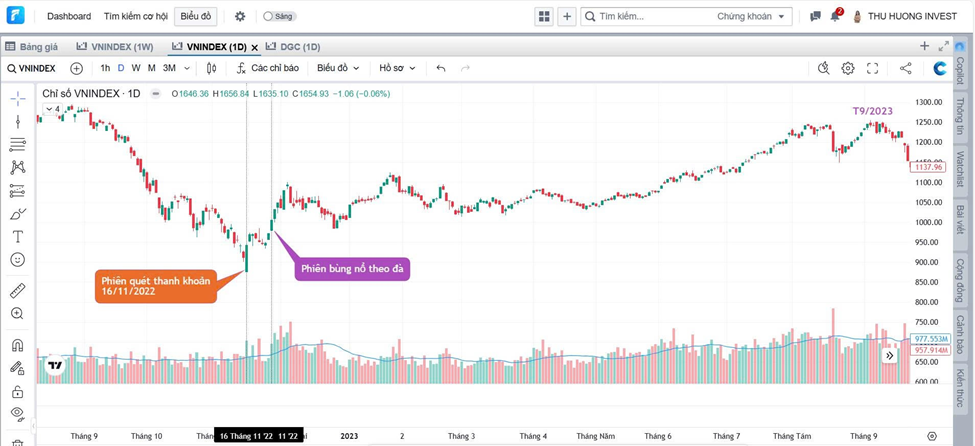 Ví dụ minh họa phiên "quét thanh khoản" và "FTD- bùng nổ theo đà" trong quá trình tạo đáy trung hạn của thị trường tháng 11/2022.