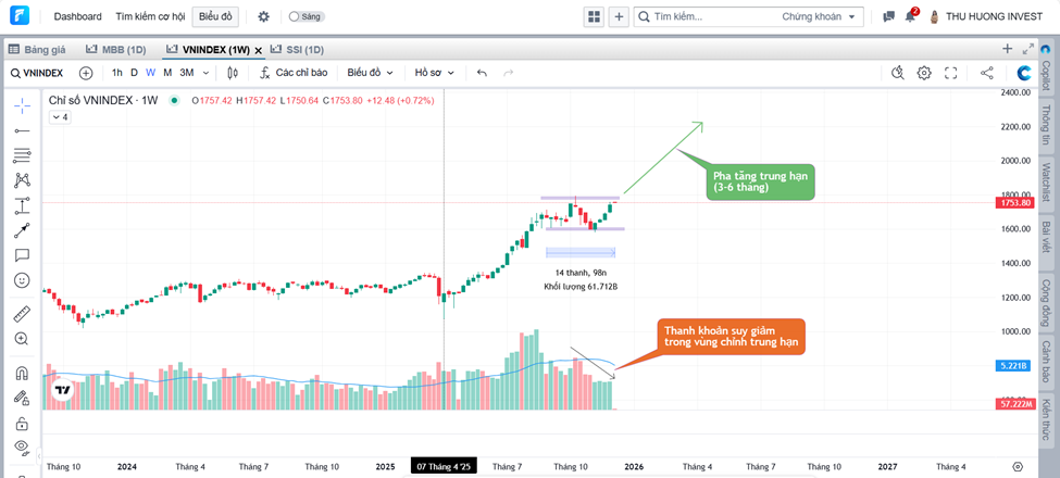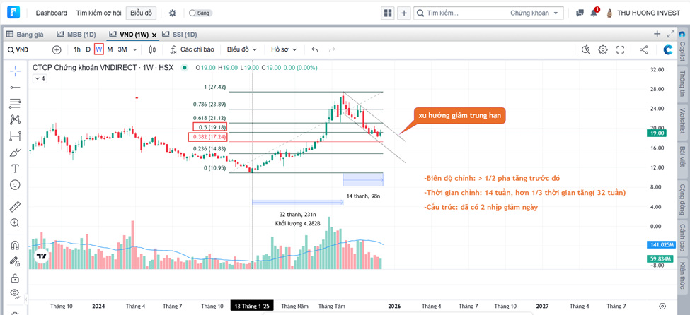 • Pha chỉnh trung hạn của VNINDEX đã kéo dài 13 tuần, các cổ phiếu đã điều chỉnh tương đối đủ về thời gian, biên độ, cấu trúc của pha điều chỉnh → xác suất cao sẽ hoàn thành ở mốc 17 tuần – nửa cuối tháng 12/2025.