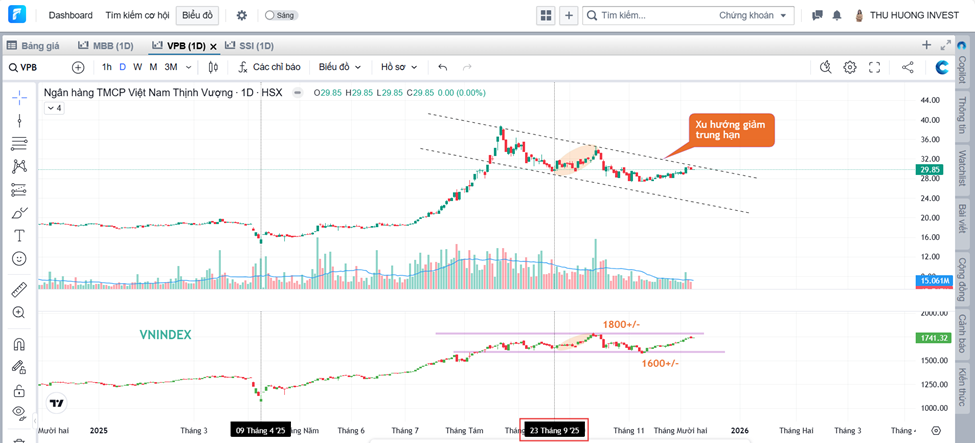 (Hình minh họa nhịp hồi của VNINDEX và cổ phiếu VPB nhóm ngân hàng T9-T10/2025)