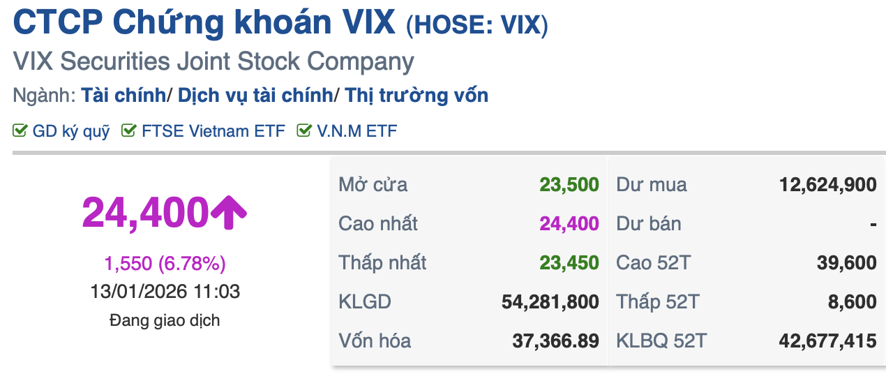 CTCP Chứng khoán VIX (HOSE: VIX) tăng 6,78% lên 24.400 đồng/cổ phiếu, với thanh khoản bùng nổ hơn 54,2 triệu cổ phiếu, vượt xa mức giao dịch trung bình 52 tuần. Vốn hóa VIX đạt khoảng 37.367 tỷ đồng, trong khi dư mua tại giá cao nhất lên tới hơn 12,6 triệu đơn vị. Khối ngoại mua ròng gần 2,8 triệu cổ phiếu.