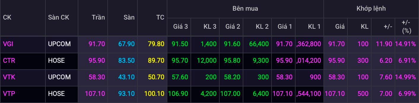 Thị trường chứng khoán phiên giao dịch cuối tuần chứng kiến sự bùng nổ của cổ phiếu “họ” Viettel. Cả 4 cổ phiếu nhóm này trên sàn là Viettel Global (VGI), Viettel Post (VTP), Viettel Construction (CTR) và Thiết kế Viettel (VTK) đều tăng kịch trần, thậm chí “trắng bên bán”.