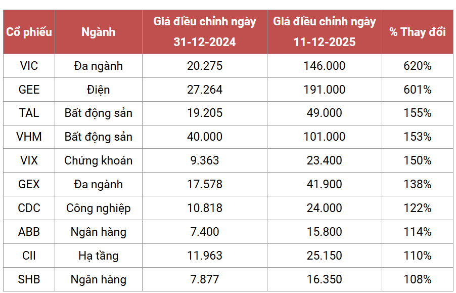 Theo thống kê của phóng viên Tuổi Trẻ Online, trong nhóm VN30, một số cổ phiếu tăng mạnh gồm VIC tăng 620% lên hơn 144.000 đồng/cổ phiếu, SHB tăng 108% lên 16.350 đồng/cổ phiếu, VJC tăng 88% lên 188.000 đồng/cổ phiếu và VHM cũng duy trì mức tăng đáng kể.