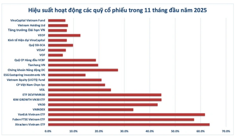 Theo FiinGroup, trong 11 tháng đầu năm 2025 có 52/76 quỹ cổ phiếu có hiệu suất thấp hơn VN-Index (+33,5%), chủ yếu ở nhóm quỹ mở và quỹ đóng.