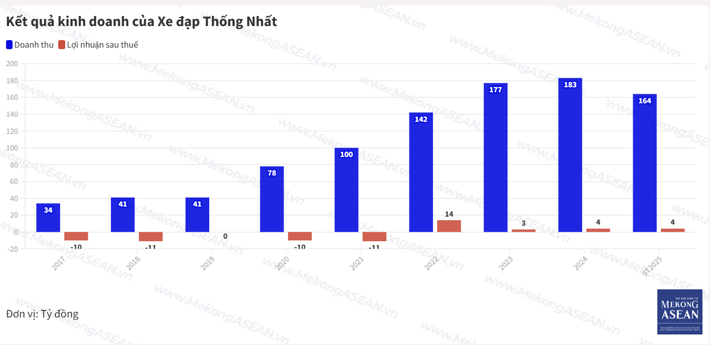 Sự “hồi sinh” của Xe đạp Thống Nhất được thể hiện phần nào qua kết quả kinh doanh. Doanh thu năm 2024 của công ty này đạt 183 tỷ đồng, gấp hơn 5 lần thời điểm bắt đầu cổ phần hoá (năm 2017). Năm 2022, lợi nhuận công ty đạt mức 14 tỷ đồng, cao nhất kể từ khi công bố báo cáo tài chính (năm 2011). 9 tháng đầu năm 2025, Xe đạp Thống Nhất đạt 164 tỷ đồng doanh thu, tăng 24% so với cùng kỳ năm ngoái (YoY); lợi nhuận sau thuế đạt 3,6 tỷ đồng, giảm 28% YoY. Từ năm 2022 đến nay, công ty liên tục có lãi, so với giai đoạn 2017 - 2021 đa phần thua lỗ.