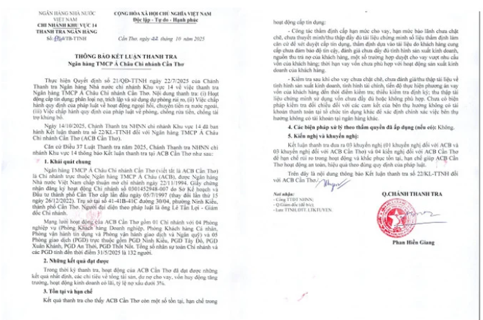 Thanh tra Ngân hàng Nhà nước (NHNN) chi nhánh Khu vực 14 đã công khai Thông báo Kết luận thanh tra đối với Ngân hàng TMCP Á Châu chi nhánh Cần Thơ (ACB Cần Thơ). Kết quả thanh tra cho thấy ACB Cần Thơ còn một số tồn tại, hạn chế trong hoạt động cấp tín dụng.