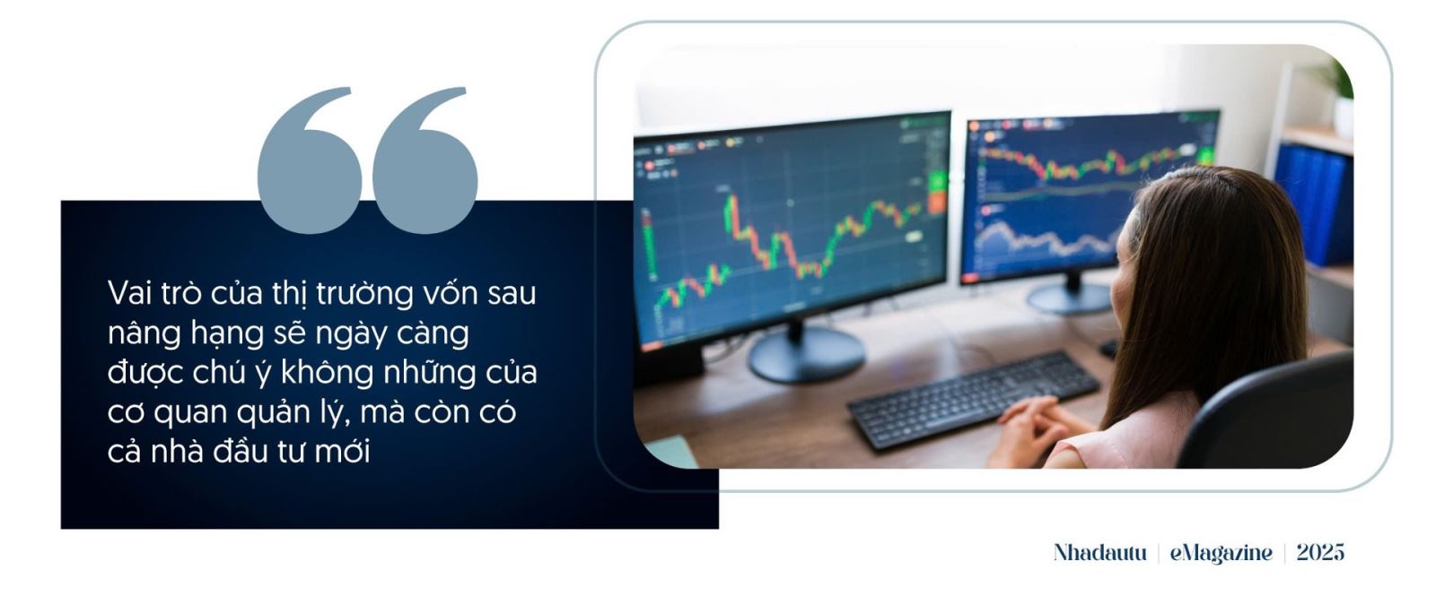 Thứ hai, nâng hạng mở đầu cho chu kỳ thay đổi cấu trúc nhà đầu tư trên TTCK. Sau một thời gian khối ngoại bán ròng, cơ cấu sở hữu của nhà đầu tư cá nhân chiếm 85-90% giá trị giao dịch, và chiếm 99% tỷ lệ sở hữu tài khoản. Với sự kiện nâng hạng, tôi kỳ vọng vào sự gia tăng cả về chất và lượng của nhà đầu tư tổ chức, quỹ đầu tư. Điều này sẽ giúp thị trường ổn định hơn, bền vững hơn.