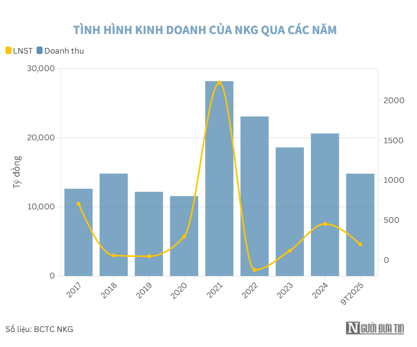 Lũy kế năm 2025, Thép Nam Kim ghi nhận doanh thu thuần hơn 14.800 tỷ đồng và lợi nhuận ròng đạt 197 tỷ đồng, lần lượt giảm 28% và 56% so với năm trước.