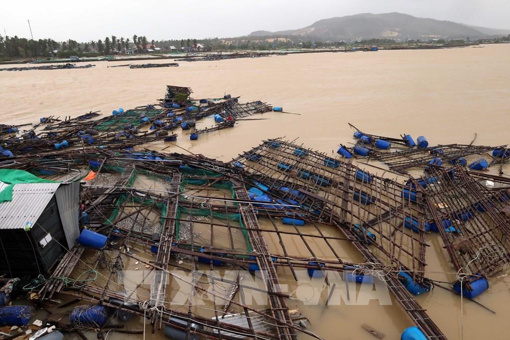 Mưa lũ gây thiệt hại nặng nề các lồng bè nuôi trồng thủy sản tại xã Xuân Cảnh, tỉnh Đắk Lắk. Ảnh: Phạm Kha - TTXVN