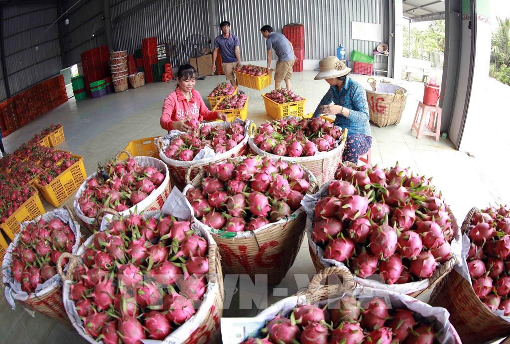 Phân loại thanh long để xuất khẩu tại Hợp tác xã thanh long Long Hội ở xã An Lục Long, huyện Châu Thành, tỉnh Long An. Ảnh: Vũ Sinh – TTXVN