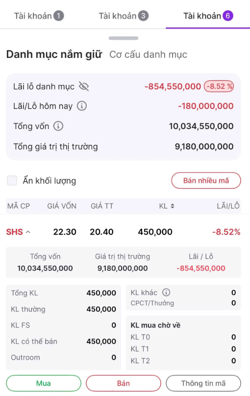 Cụ thể, theo chị Như, ngày 12/1/2025 trên ứng dụng VPS của chị ở tài khoản đuôi 6 (tài khoản margin) có 400.000 cổ phiếu SHS với giá vốn là 22,28 nghìn đồng. Sang ngày 13/1, chị có chuyển 50.000 cổ phiếu này có giá vốn 20,99 nghìn đồng từ tài khoản đuôi 3 (vay ký quỹ ưu đãi lãi suất hay còn gọi tài khoản hợp tác) sang tài khoản đuôi 6.