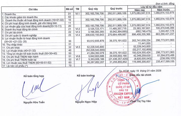 Về tình hình kinh doanh, trong quý IV/2025, Dragon Capital ghi nhận doanh thu thuần đạt 302,2 tỷ đồng, tăng 3,3% so với quý trước. Tuy nhiên, lợi nhuận sau thuế chỉ đạt 30,3 tỷ đồng, giảm nhẹ 3,1% so với mức 31,3 tỷ đồng so với quý trước. Kết quả này cho thấy biên lợi nhuận tiếp tục bị thu hẹp trong bối cảnh chi phí duy trì ở mức cao.