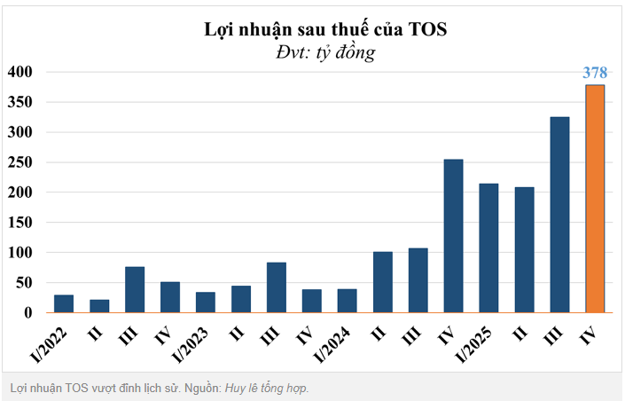 Theo báo cáo tài chính quý 4/2025 vừa công bố, CTCP Dịch vụ biển Tân Cảng (mã: TOS) ghi nhận lợi nhuận sau thuế đạt 378 tỷ đồng, tăng trưởng gần 49% so với cùng kỳ năm ngoái. Kết quả này đến từ việc doanh thu thuần trong quý 4 đạt 1.932 tỷ đồng, tăng 5% so với cùng kỳ.