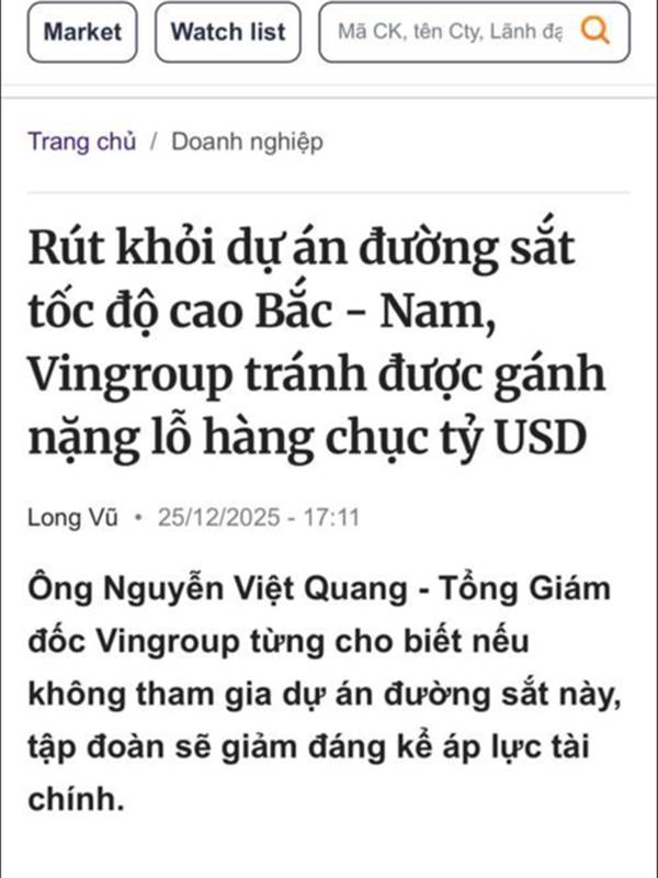 VIC rút khỏi dự án đường sắt là tin tốt vì dự án này làm chắc chắn lỗ nặng, MAI LẠI ĐÂU VÀO ĐẤY CHẲNG QUA CHIỀU NAY 15 phút cuối CHƯA SUY NGHĨ KĨ NÊN VỘI BÁN THÔI. VIC tập trung vào các đại dự án khu ...Thêm