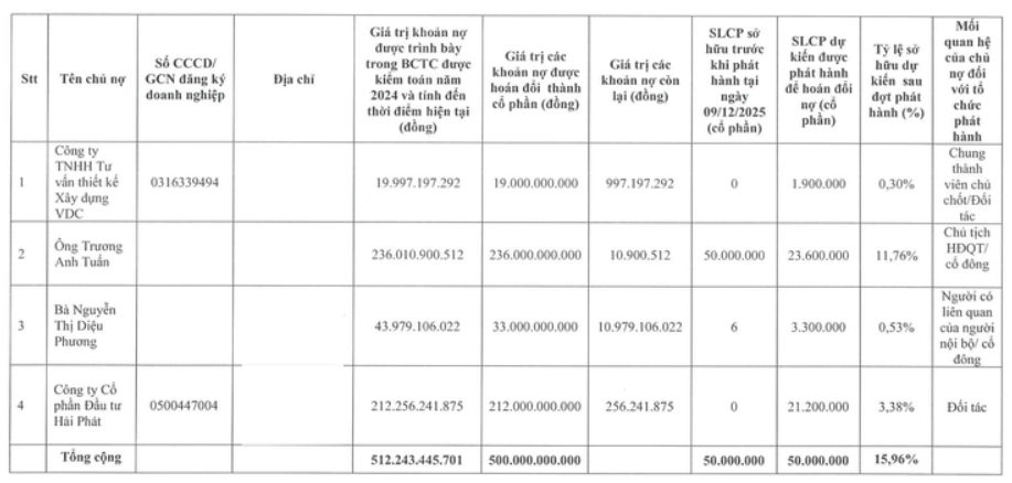 Phương án này dự kiến thực hiện trong năm 2025-2026, sau khi được Ủy ban Chứng khoán Nhà nước chấp thuận. 4 chủ nợ dự kiến được phát hành cổ phiếu riêng lẻ để hoán đổi nợ gồm: Công ty CP Đầu tư Hải Phát (212 tỉ đồng nợ lấy 21,2 triệu cổ phiếu), Công ty TNHH Tư vấn thiết kế xây dựng VDC (19 tỉ đồng nợ lấy 1,9 triệu cổ phiếu); ông Trương Anh Tuấn, Chủ tịch hội đồng quản trị (236 tỉ đồng lấy 23,6 triệu cổ phiếu), bà Nguyễn Thị Diệu Phương, vợ ông Tuấn (33 tỉ đồng lấy 3,3 triệu cổ phiếu).