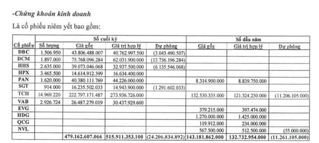 Trong danh mục này, khoản đầu tư lớn nhất là cổ phiếu TCH của Công ty Cổ phần Đầu tư Dịch vụ Tài chính Hoàng Huy, với giá gốc gần 223 tỷ đồng, trong khi giá trị hợp lý tại cuối năm ước khoảng 274 tỷ đồng. Ngoài TCH, Lideco còn phân bổ vốn vào một số cổ phiếu khác như DCM, PAN, DBC…