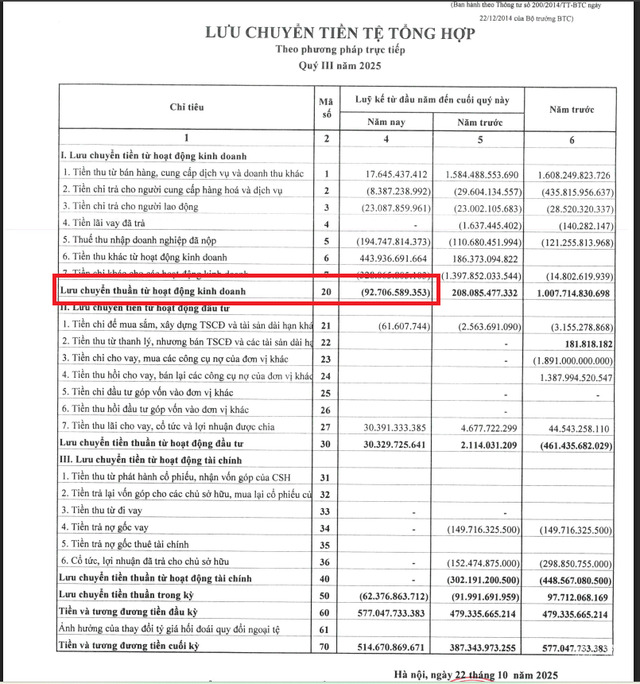 Báo cáo lưu chuyển tiền tệ cũng cho thấy dòng tiền kinh doanh tính đến cuối quý III là âm gần 93 tỷ đồng, trong khi cùng kỳ năm trướcdương 208 tỷ đồng. Nguyên nhân được đưa ra là do NTL chi lớn cho các hoạt độngkinh doanh và thuế thu nhập doanh nghiệp.