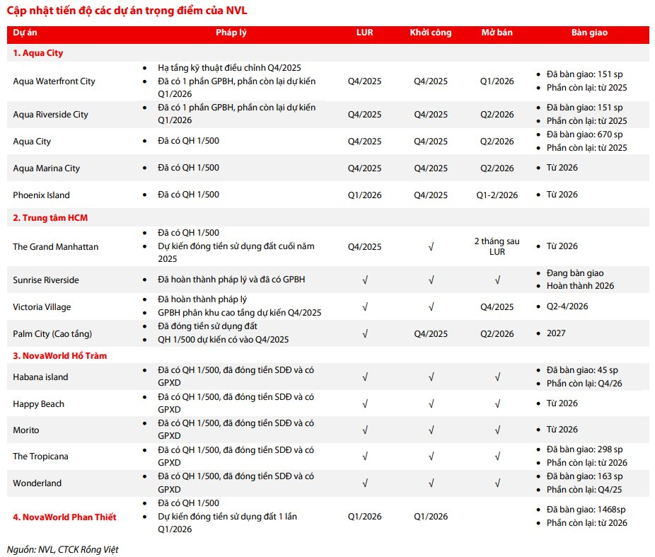 Theo báo cáo phân tích của CTCP Chứng khoán Rồng Việt (VDSC), sự phục hồi doanh thu tại cả bốn cụm dự án cho thấy NVL đang từng bước mở khóa các điểm nghẽn pháp lý, đồng thời nâng cao dòng tiền thông qua tăng tốc bàn giao và thu tiền khách hàng.