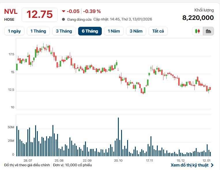 Trên thị trường chứng khoán, kết phiên 13/01, giá cổ phiếu NVL ở mức 12.750 đồng/cổ phiếu, giảm 0,39% so với phiên trước, khối lượng cổ phiếu giao dịch khớp lệnh đạt hơn 8,2 triệu đơn vị.