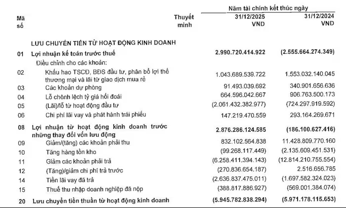 Báo cáo lưu chuyển tiền tệ cho thấy dòng tiền thuần từ hoạt động kinh doanh của Novaland vẫn thâm hụt nặng hơn 5.900 tỷ đồng trong năm 2025, tương đương với cùng kỳ. Nguyên nhân là tăng các khoản phải trả và lỗ từ hoạt động đầu tư.