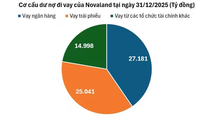 Tại cuối năm 2025, tổng dư nợ vay tài chính cả ngắn và dài hạn của Novaland gần 67.200 tỷ đồng, trong đó ngân hàng chiếm 41%, kế tiếp là kênh trái phiếu trong nước chiếm 37%, 22% còn lại từ các tổ chức tài chính nước ngoài.