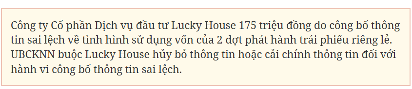 Công ty Cổ phần Đầu tư Summer Beach cũng bị xử phạt 92,5 triệu đồng, do không công bố thông tin đối với báo cáo tình hình sử dụng số tiền từ phát hành trái phiếu được kiểm toán bán niên 2023; không công bố thông tin không đúng thời hạn theo quy định pháp luật đối với tài liệu như báo cáo tình hình sử dụng số tiền thu từ phát hành trái phiếu được kiểm toán bán niên 2024.