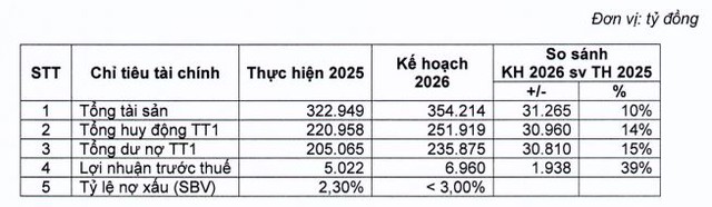 Tổng tài sản mục tiêu đến cuối năm 2026 đạt 354.214 tỷ đồng, tăng 10% so với cuối năm 2025. Tổng huy động TT1 dự kiến 251.919 tỷ đồng và tổng dư nợ TT1 mục tiêu đạt 235.875 tỷ đồng, lần lượt tăng 14% và 15% so với năm 2025.