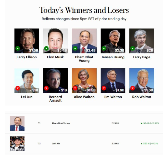 Cùng với nhịp tăng của cổ phiếu VIC, tài sản của ông Phạm Nhật Vượng cũng tăng chóng mặt. Theo số liệu thời gian thực của Forbes, tài sản của ông đạt 30 tỷ USD, tăng thêm 3,4 tỷ USD chỉ trong một ngày. Thành tích này đưa ông đứng vị trí thứ 71 trong danh sách những người giàu nhất thế giới, vượt qua cả tỷ phú Jack Ma, người đang sở hữu 29,6 tỷ USD. Jack Ma được biết đến là một trong những vị tỷ phú giàu nhất Trung Quốc, và là nhà sáng lập Alibaba Group.