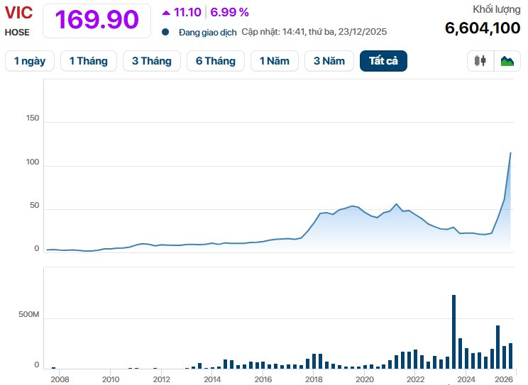 Trong một diễn biến liên quan, gần 3,9 tỷ cổ phiếu VIC do Vingroup phát hành tăng vốn từ nguồn vốn chủ sở hữu sẽ được niêm yết bổ sung từ ngày 18/12. Ngày giao dịch chứng khoán thay đổi niêm yết là 31/12/2025.