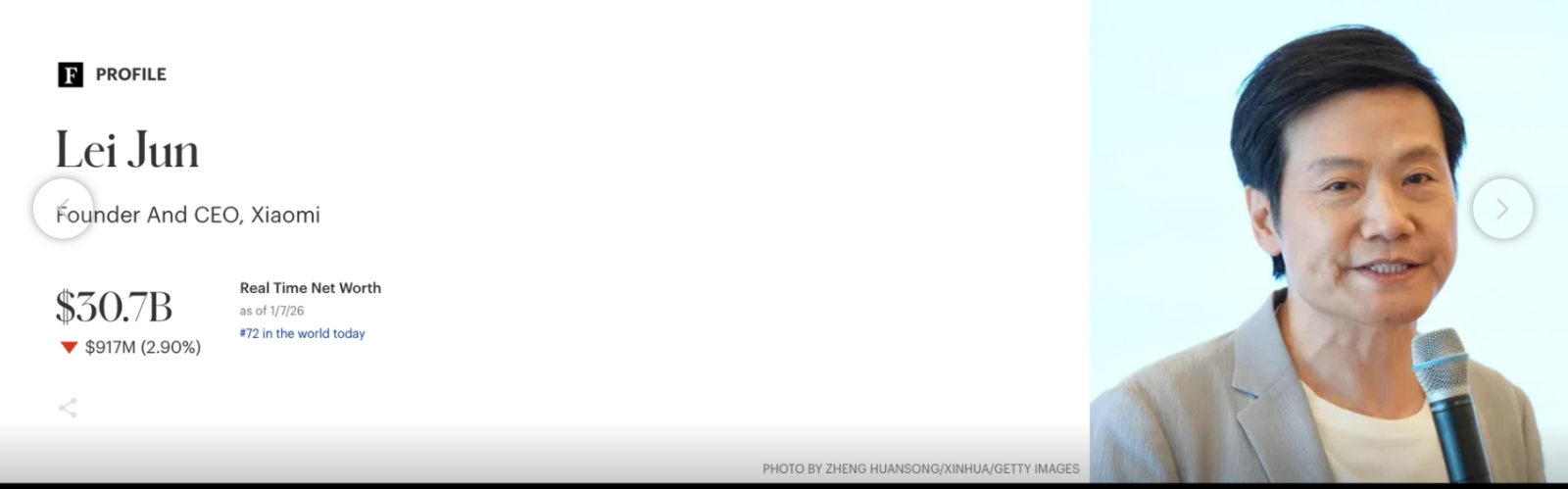 Tài sản tỷ phú Phạm Nhật Vượng đã vượt qua tỷ phú Lôi Quân - nhà sáng lập kiêm CEO Xiaomi - trên bảng xếp hạng Forbes. Ảnh: Forbes.