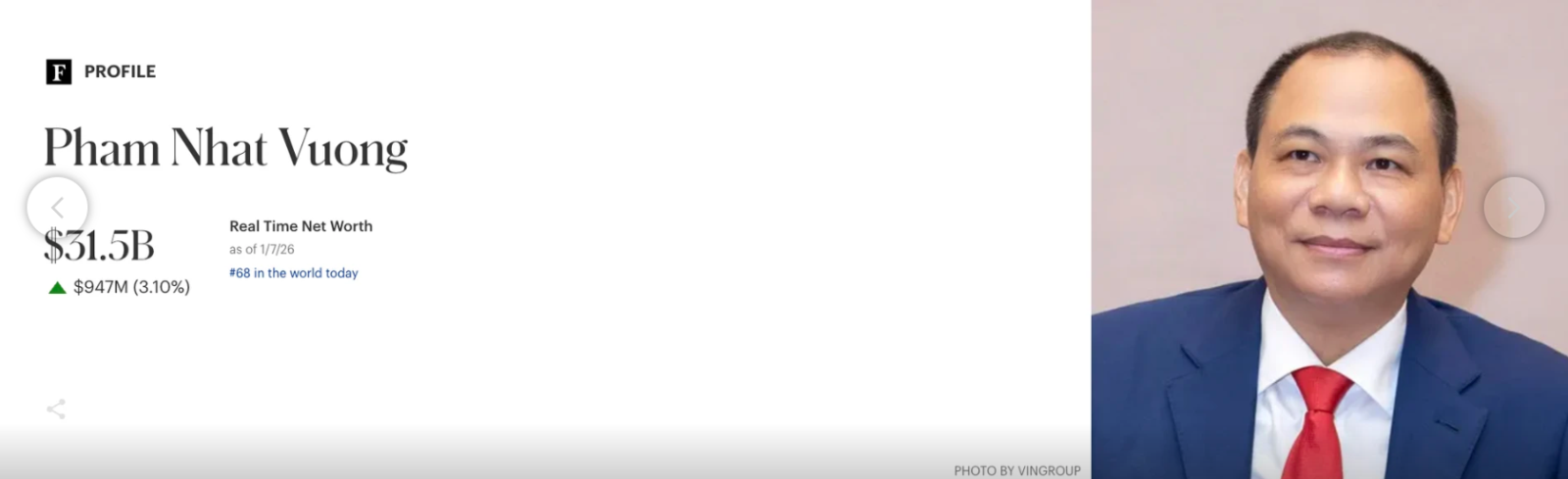 Theo dữ liệu cập nhật từ Forbes, khối tài sản của ông Vượng hiện đạt khoảng 31,5 tỷ USD, tăng 947 triệu USD chỉ trong vòng 24 giờ qua. Kết quả này giúp vị doanh nhân Việt Nam vươn lên vị trí thứ 68 trong danh sách những người giàu nhất thế giới.