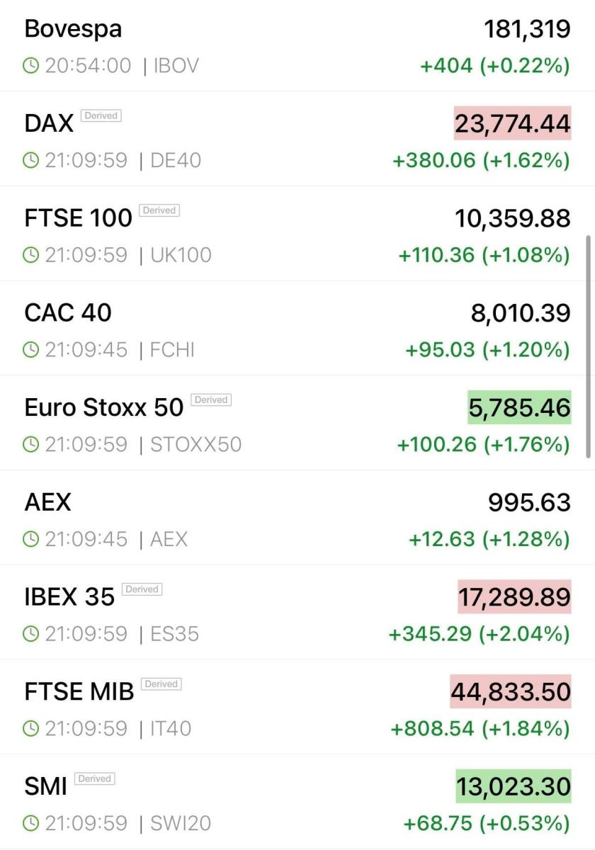 Ở thời điểm hiện tại, chứng khoán châu Âu đang “xanh mướt”. Vào đầu phiên, các chỉ số chính của chứng khoán Mỹ cũng xanh nhưng tính tới 21h18 theo giờ Hà Nội, các chỉ số này đều giảm nhẹ với Dow Jones giảm 0,42%, S&P 500 giảm 0,43% còn Nasdaq giảm 0,3%.