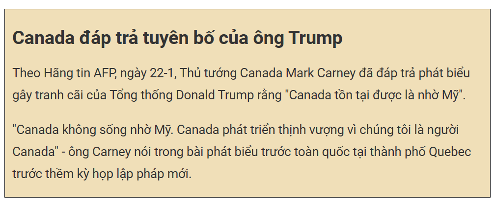 Theo Hãng tin Reuters, cú quay ngoắt của ông Trump diễn ra sau bài phát biểu của Thủ tướng Canada Mark Carney tại Diễn đàn Kinh tế thế giới (WEF) ở thị trấn Davos của Thụy Sĩ trong tuần này. Nhà lãnh đạo Canada đã công khai chỉ trích các cường quốc sử dụng hội nhập kinh tế như một loại vũ khí và dùng thuế quan làm đòn bẩy gây sức ép.