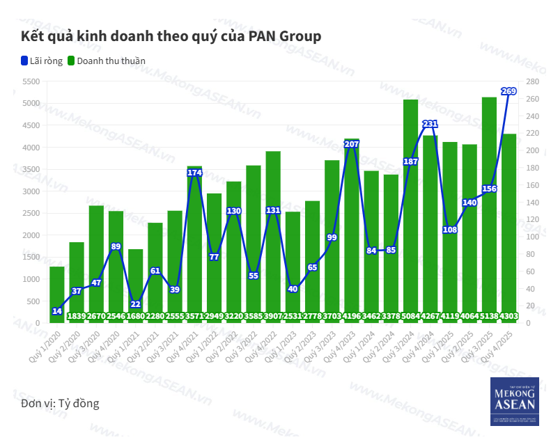 Lũy kế cả năm 2025, PAN đạt tổng doanh thu 17.588 tỷ đồng, lợi nhuận sau thuế 1.173 tỷ đồng; lần lượt tăng 9% và 0,5% so với năm 2024. Đây là năm thứ ba liên tiếp doanh nghiệp lập kỷ lục về doanh thu và năm thứ tư liên tiếp lập kỷ lục lợi nhuận.