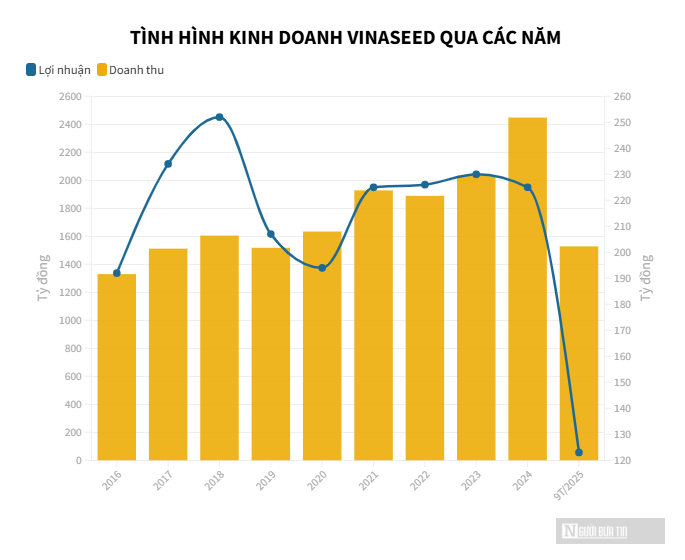 Lũy kế 9 tháng đầu năm 2025, doanh thu của Vinaseed ghi nhận tăng 3% lên gần 1.529 tỷ đồng, nhưng lợi nhuận ròng vẫn giảm 2% so với cùng kỳ, còn hơn 124 tỷ đồng. Công ty mới thực hiện được 56% kế hoạch doanh thu và 49% chỉ tiêu lợi nhuận cả năm.