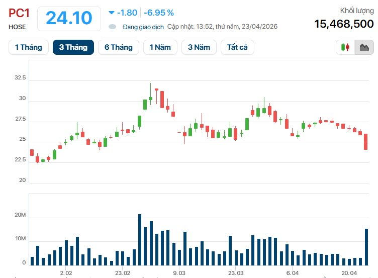 Phiên giao dịch ngày 23/4, cổ phiếu PC1 của CTCP Tập đoàn PC1 đã nhanh chóng giảm xuống mức giá sàn 24.100 đồng/cp với hiện tại có hơn 7,7 triệu cổ phiếu dư bán sàn.