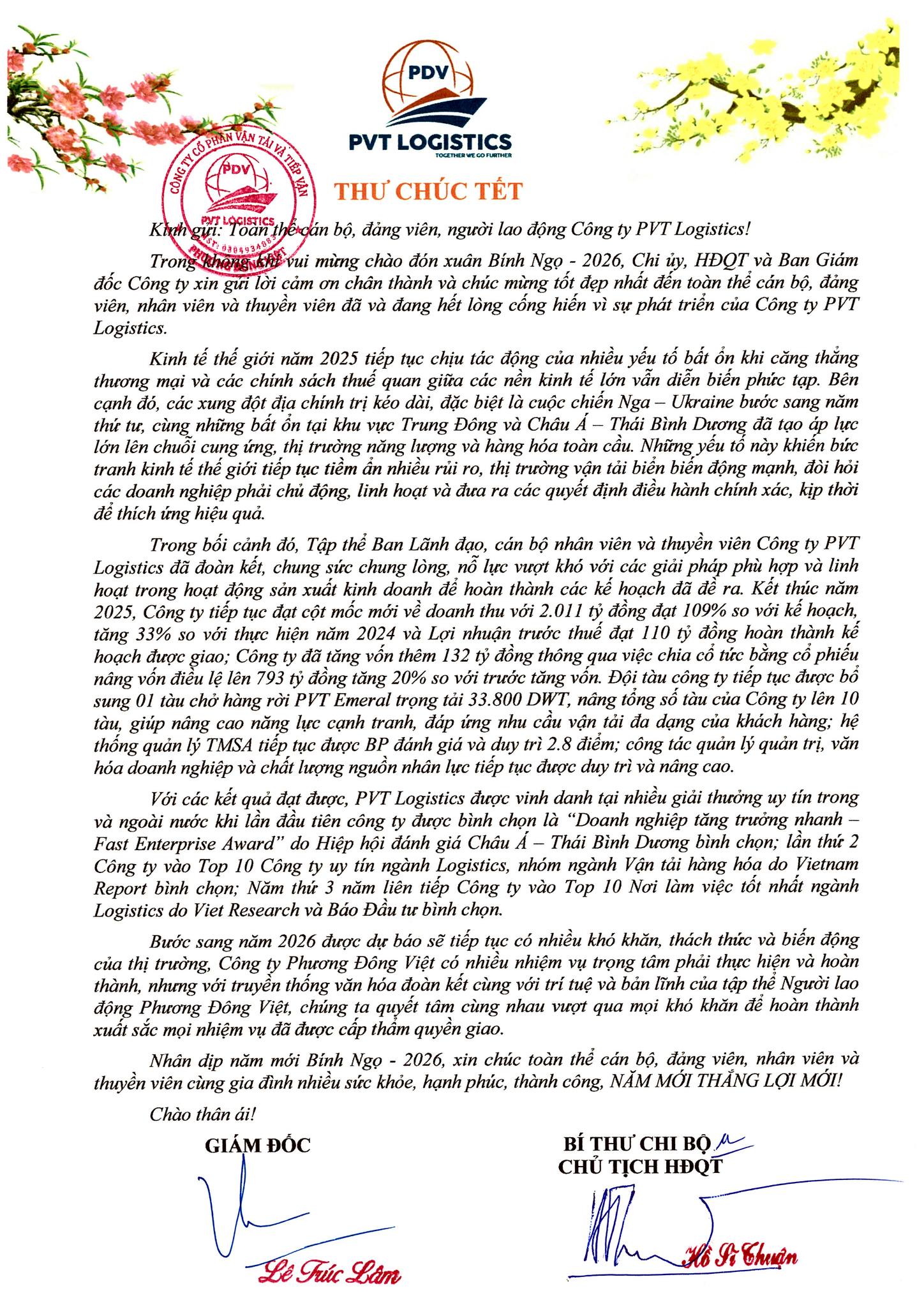 Trong thư chúc Tết gửi đến toàn thể cán bộ nhân viên, Giám đốc Lê Trúc Lâm và Chủ tịch HĐQT Hồ Sĩ Thuận đã bày tỏ sự tri ân sâu sắc đến những đóng góp của tập thể thuyền viên, nhân viên, đồng thời quyết tâm cùng nhau vượt qua mọi thách thức để hoàn thành xuất sắc các nhiệm vụ trọng tâm trong năm mới, hướng tới mục tiêu "Năm mới thắng lợi mới".